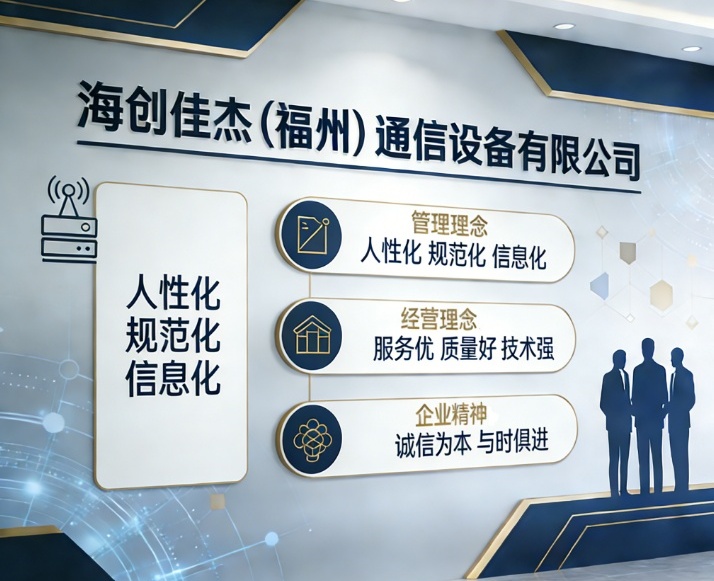 海创佳杰(福州)通信设备有限公司是以创新的理念,追求卓越、诚实守信为宗旨,高质量的产品,专业的技术团队、优质的服务, 成就你我。 创新无限,成就价值, 创意思维,造福员工,服务客户,奉献社会,是企业的使命为企业客户排忧解难,创造价值。