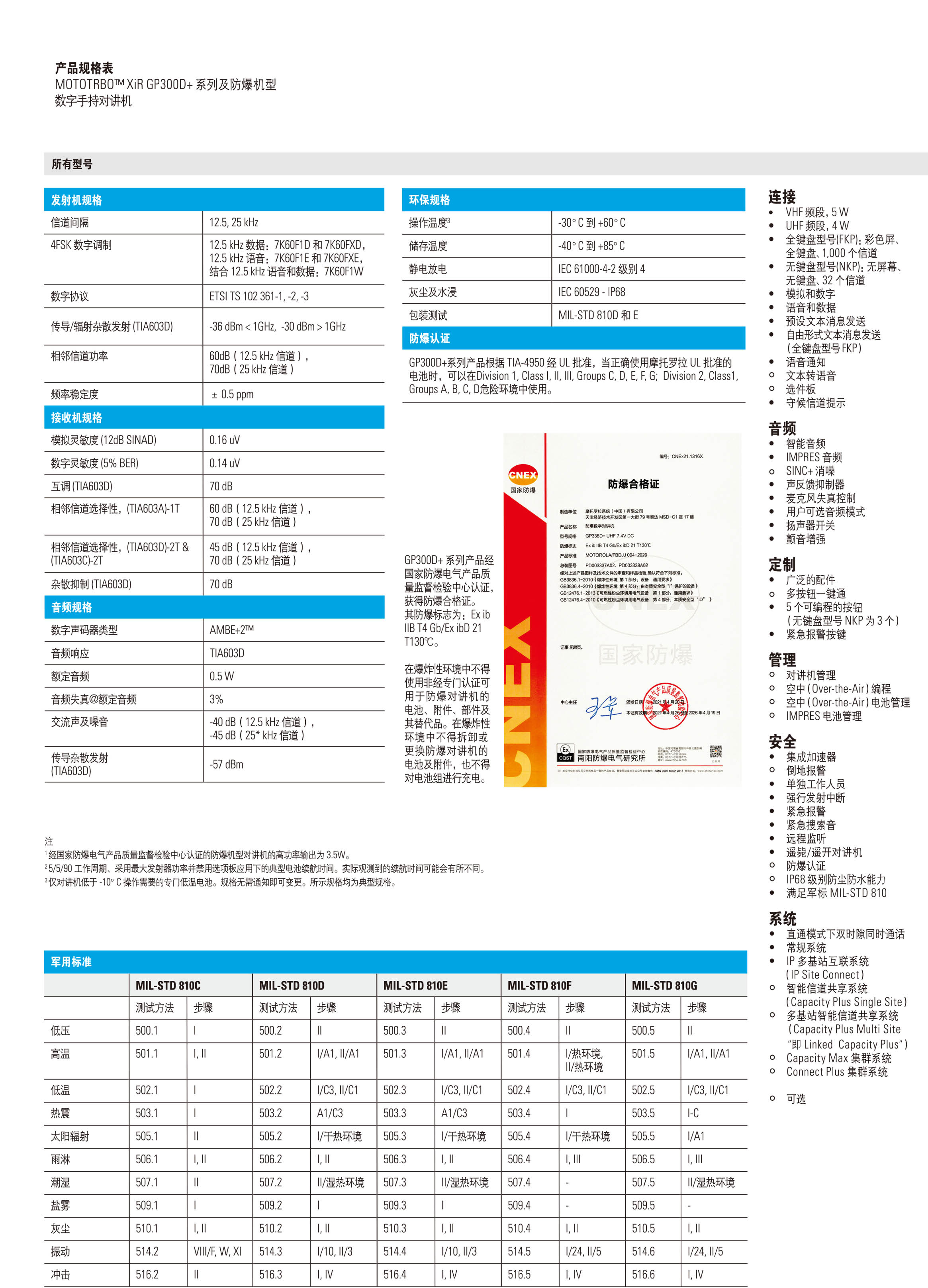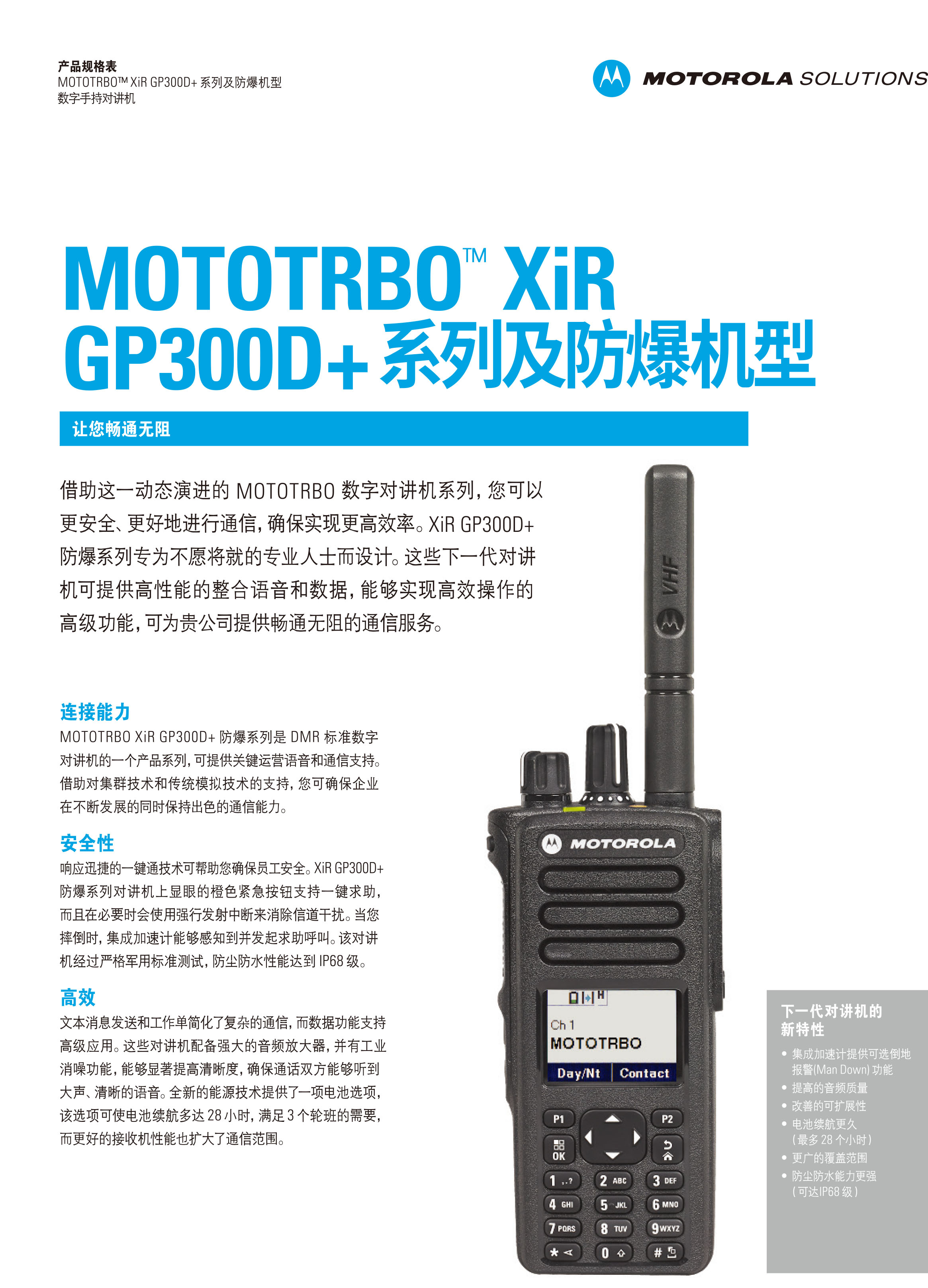 MOTOTRBO XiR GP338D+328D+防爆系列是DMR标准数字对讲机的一个产品系列,可提供关键运营语音和通信支持借助对集群技术和传统模拟技术的支持,您可确保企业在不断发展的同时保持出色的通信能力。