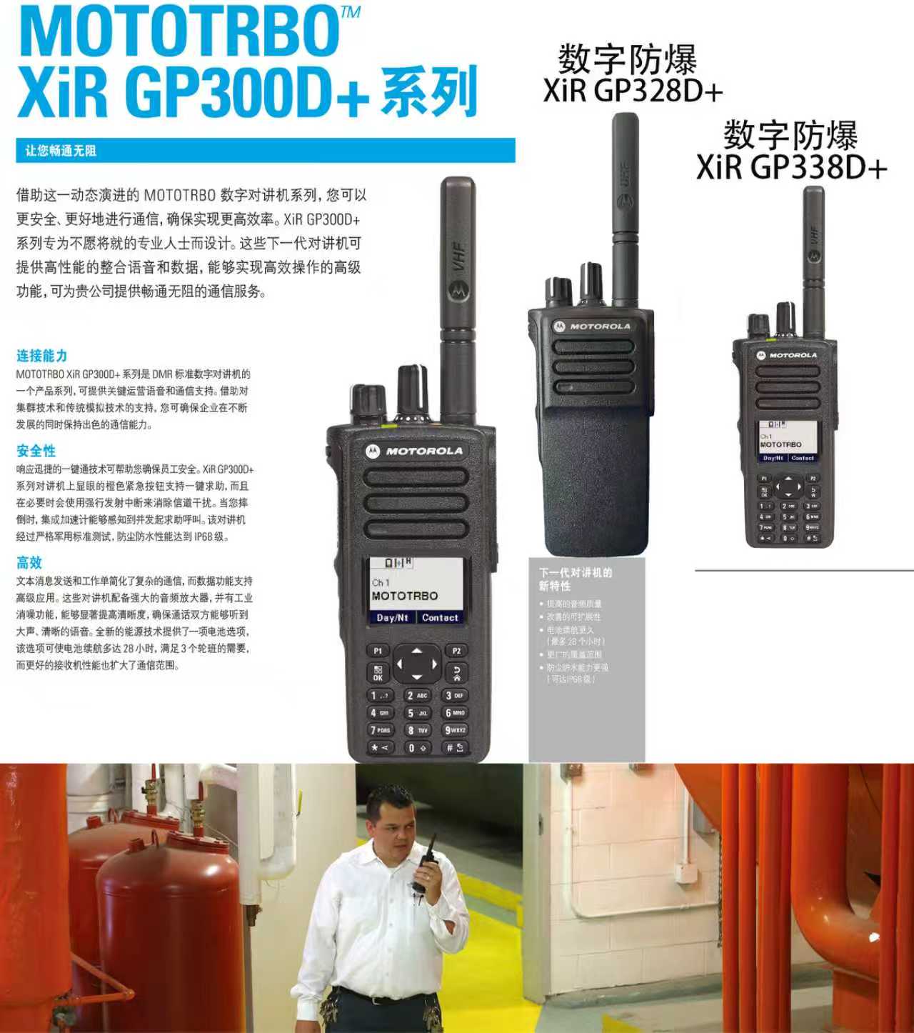MOTOTRBO XiR GP338D+防爆系列是DMR标准数字对讲机的一个产品系列,可提供关键运营语音和通信支持借助对集群技术和传统模拟技术的支持,您可确保企业在不断发展的同时保持出色的通信能力。