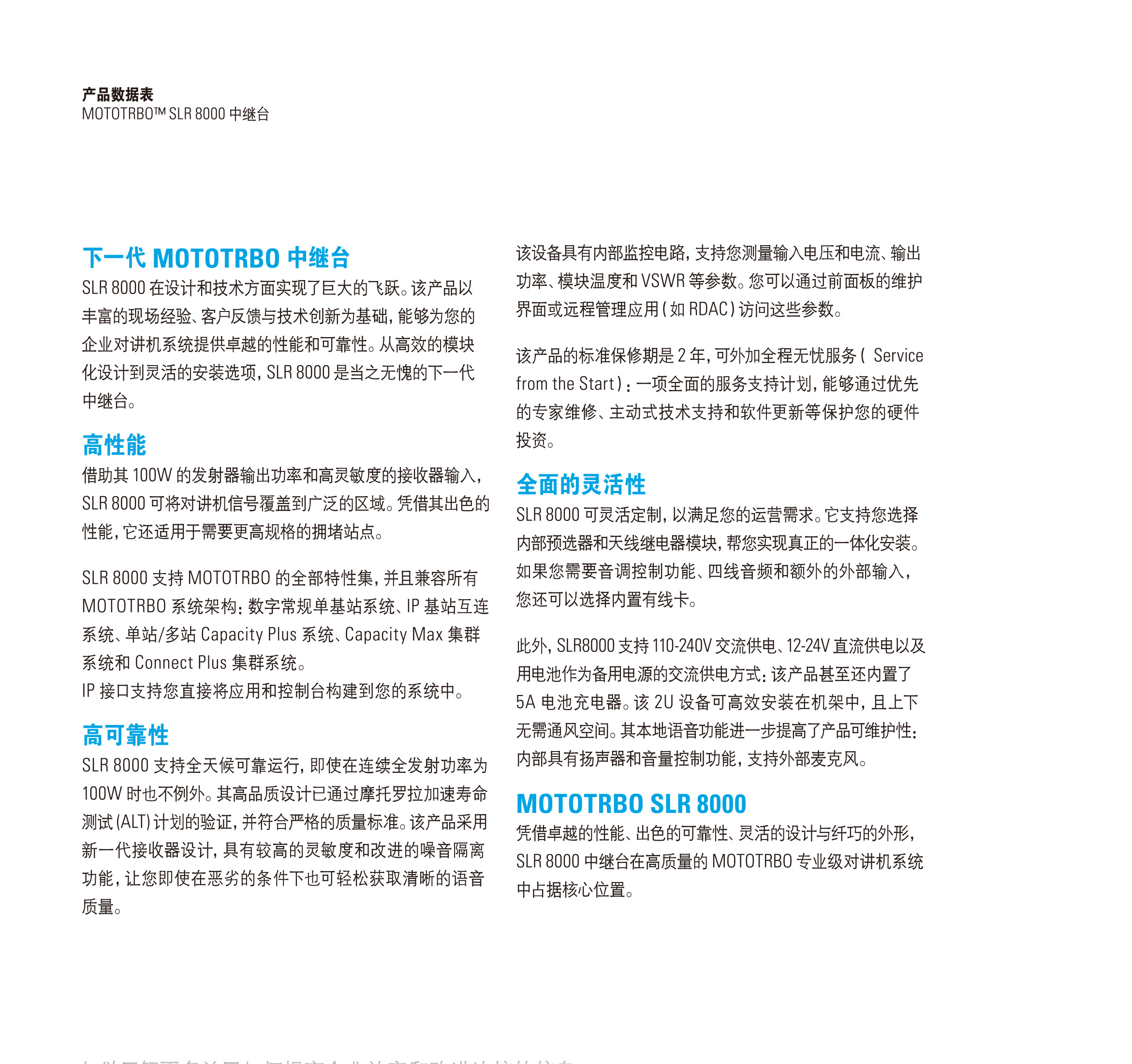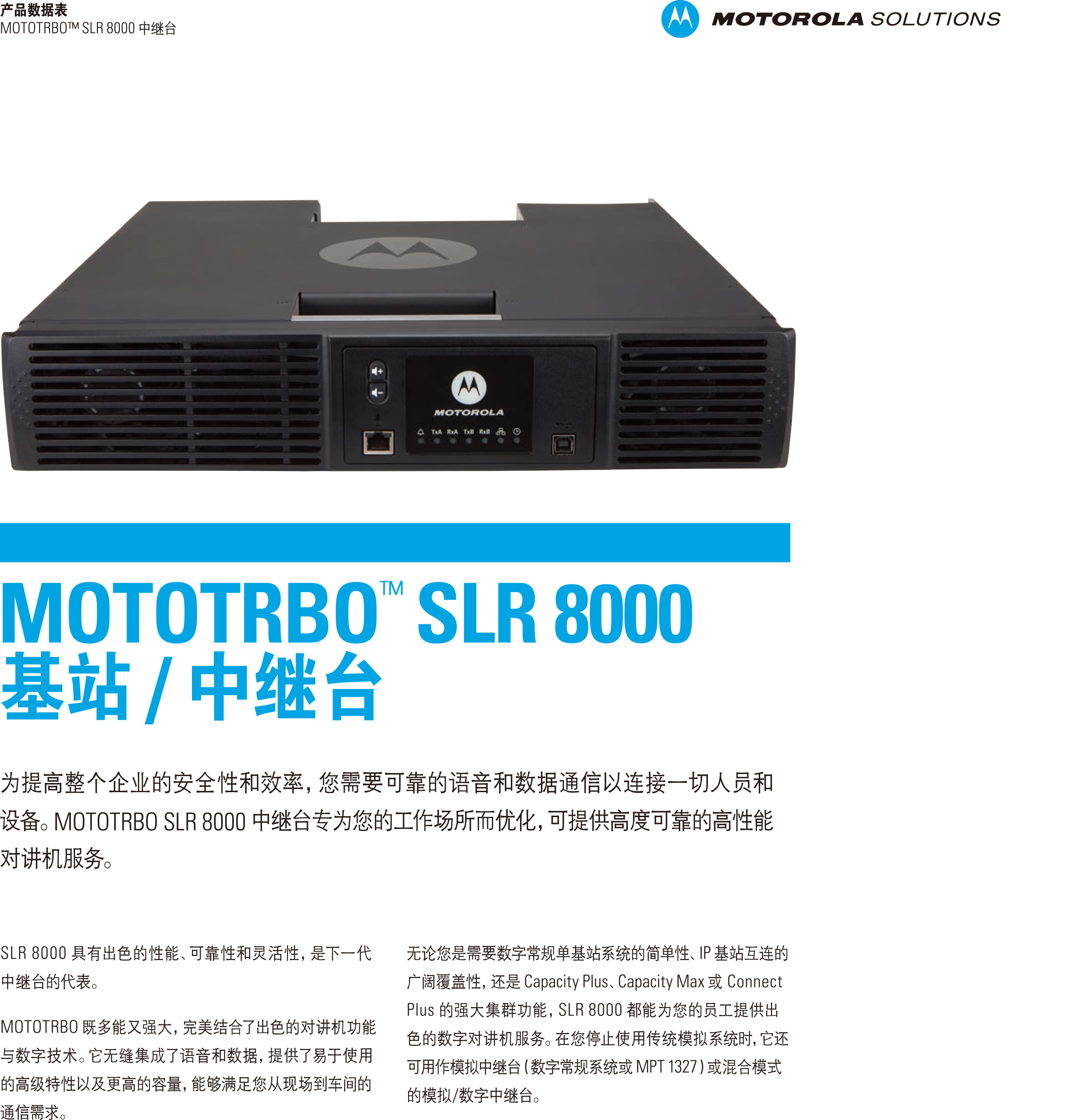 为提高整个企业的安全性和效率,您需要可靠的语音和数据通信以连接一切人员和设备。MOTOTRBOSLR8000中继台专为您的工作场所而优化,可提供高度可靠的高性能对讲机服务。SLR8000具有出色的性能、可靠性和灵活性,是下一代中继台的代表。