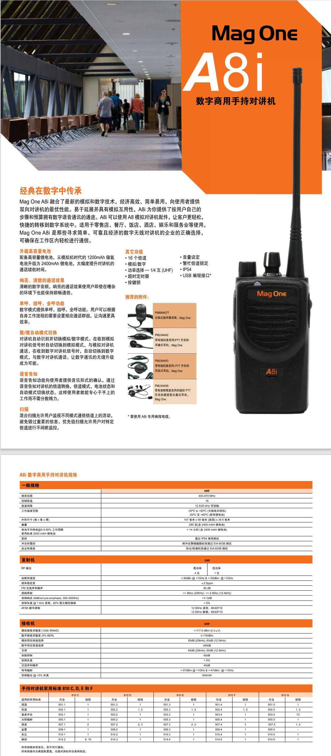 Mag One A8i 融合了模拟和数字技术,经济高效、简单易用,向使用者提供双向对讲机的可靠性能。易于延展并具有模拟互用性,A8i 为你提供了按用户自己的步骤和预算拥有数字语音通讯的通途。A8i 可以使用 A8 模拟对讲机配件,让客户更轻松,快捷的转移到数字系统中。适用于零售店、餐厅、饭店、酒店、娱乐和服务业等使用,Mag One A8i 是那些寻求简单、可靠且经济的数字无线对讲机的企业的正确选择,可确保在工作区内轻松进行通信。